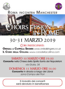 Concerti Sabato 30 Marzo 2019 ore 19.00 Choires Fusion in Rome – 1insieme all’Ordsall A Cappella Singers di Manchester Chiesa dello Spirito Santo dei Napoletanivia Giulia 34 Domenica 31 Marzo 2019 ore 16.00 Choires Fusion in Rome – 2insieme all’Ordsall A Cappella Singers di Manchester Largo dei Librari Domenica 31 Marzo 2019 ore 19.00 Tutti insieme con blu Alikéinsieme all’Ordsall A Cappella Singers di Manchester Pagine: 123456789101112131415161718192021222324252627282930313233343536373839404142434445464748495051525354555657585960616263646566676869